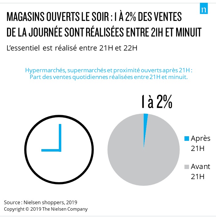 Le gouvernement envisage d’autoriser l’ouverture après 21 heures dans les commerces alimentaires. Selon Nielsen, les magasins ouvrant entre 21h et minuit réalisent sur cette période 1 à 2% de leur chiffre d’affaires.